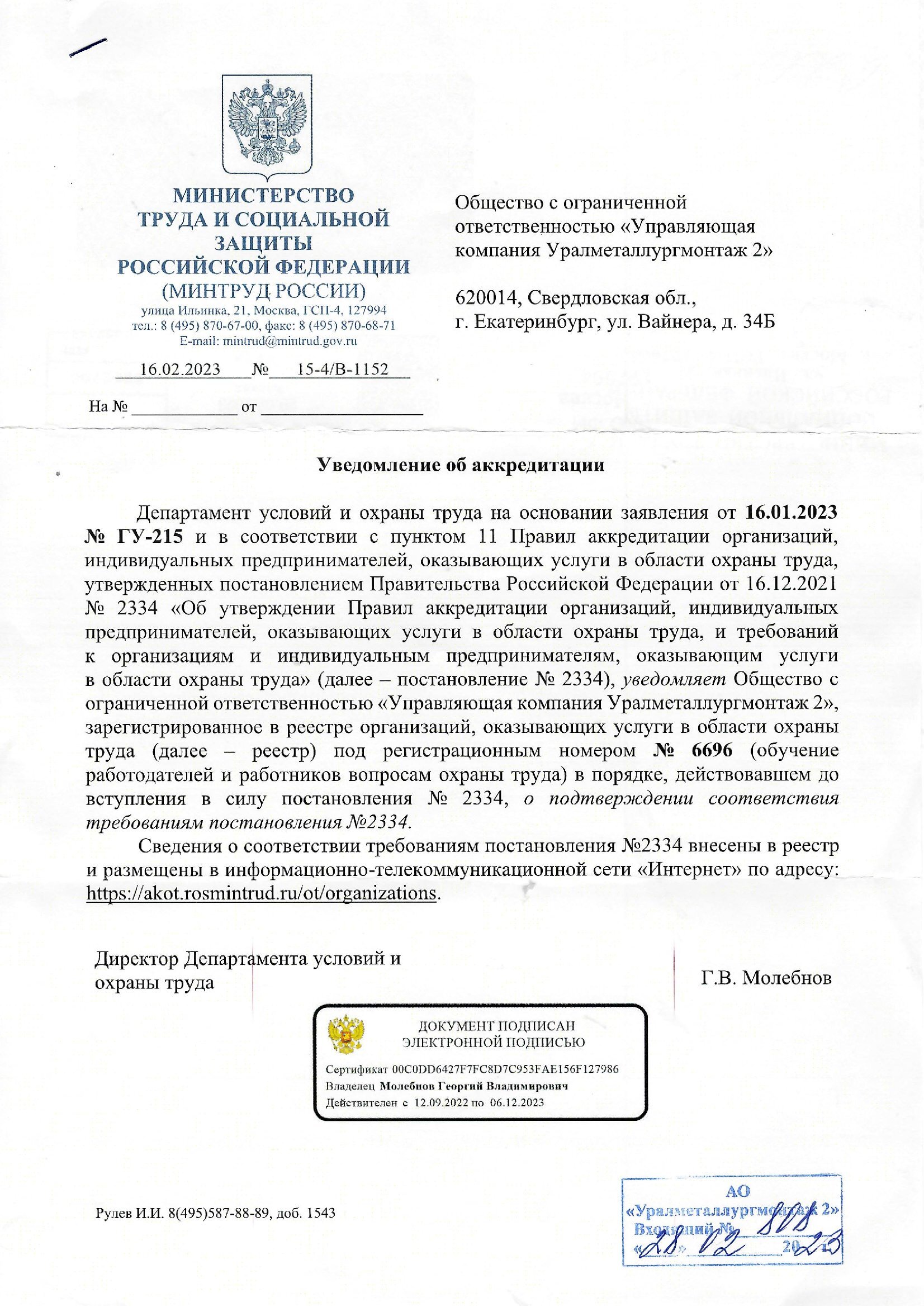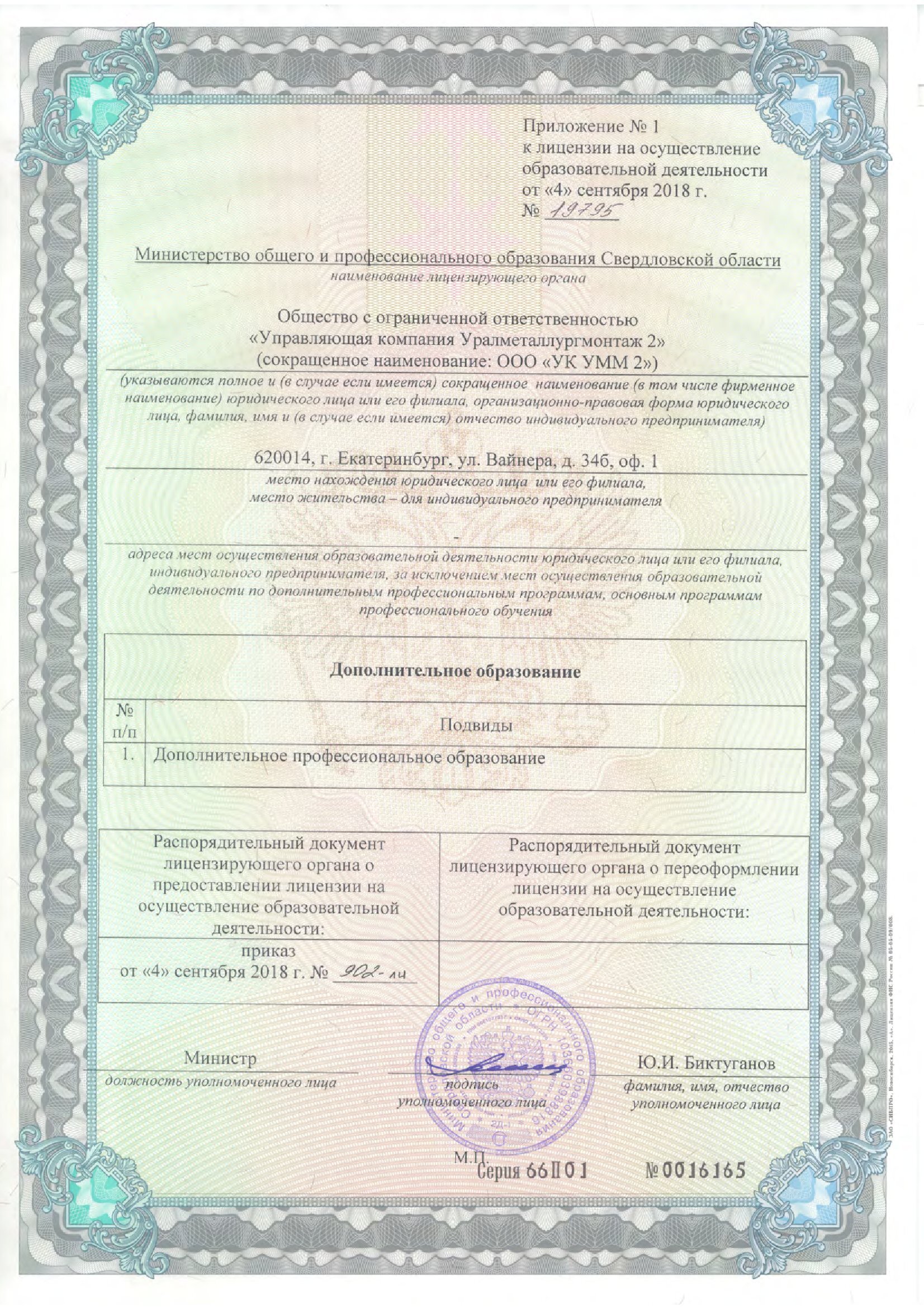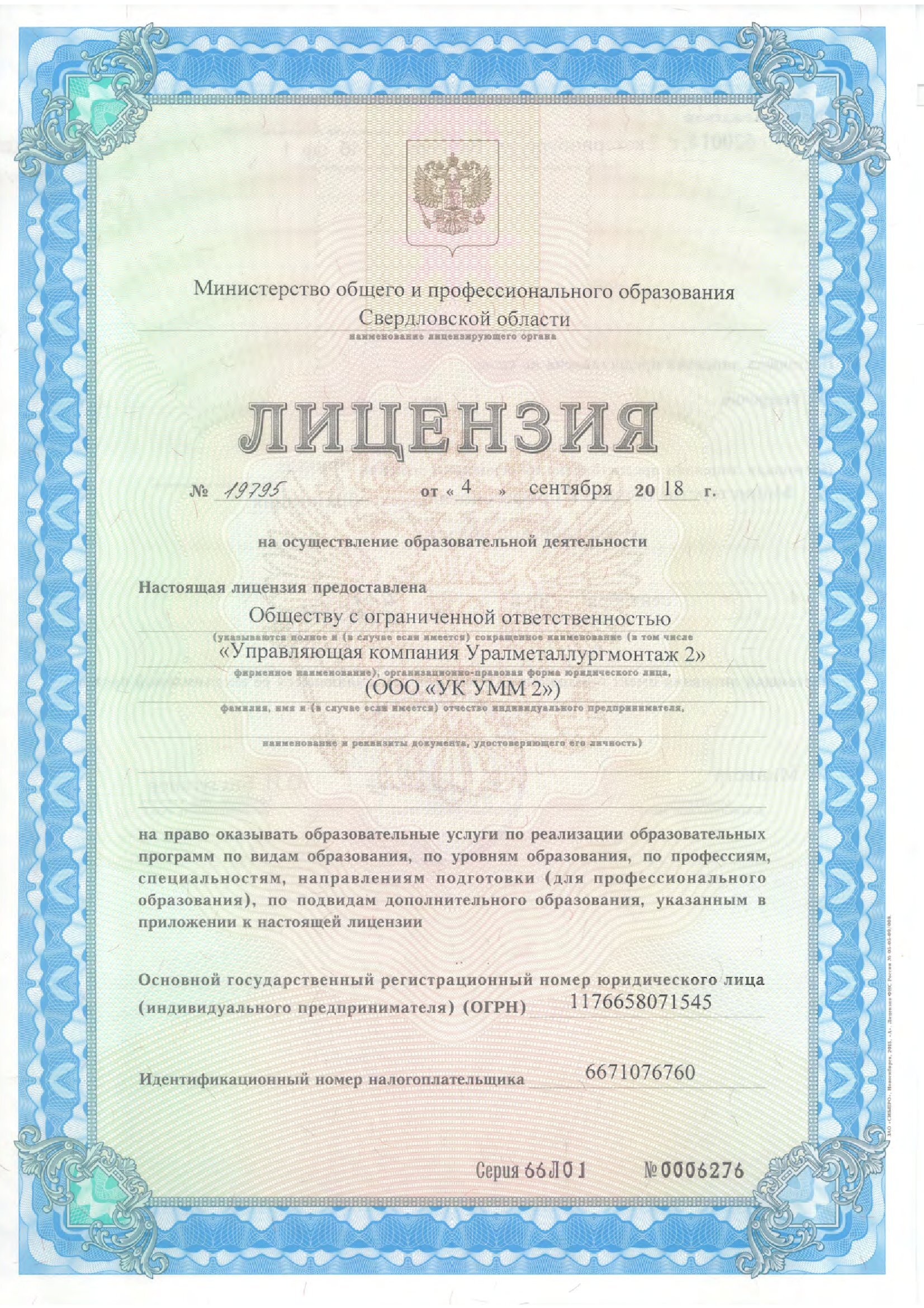 Учебный центр ООО «УК УММ2» проводит обучение на основании образовательной лицензии и аккредитации Министерства труда и социальной защиты РФ в области охраны труда.